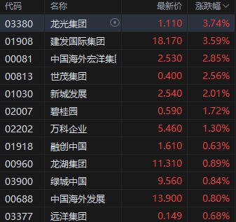 港股内房股集体上涨,其中,龙光集团、建发国际涨近4%,世茂集团、中国海外宏洋集团涨近3%,新城发展涨2%,碧桂园涨1.7%,万科企业、融创中国、龙湖集团、绿城中国、远洋集团齐涨。