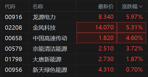 港股异动丨风电股继续上涨 龙源电力涨6%录得4连涨 金风科技涨超5%