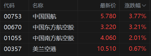 港股航空股普遍上涨,其中,中国国航涨近4%,中国东方航空涨3.2%,中国南方航空涨2%,美兰空港跟涨。