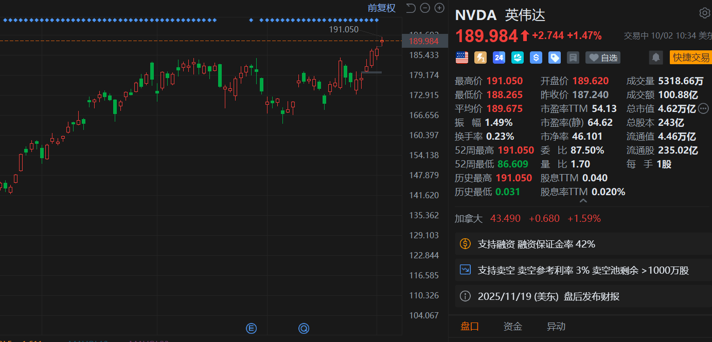 英伟达(NVDA.US)盘初涨2%,高见191.05美元创历史新高。消息上,花旗发表研究报告,表示与英伟达管理层交流后,目前对公司发展前景及竞争定位转趋正面,预测截至10月底止第三财季及截至明年1月底止第四财季销售额将分别达540亿及620亿美元,同时将2026及2027年预测上调1%及10%,目标价从200美元上调至210美元。英伟达将于本月底在华盛顿举行GPU技术大会(GTC),行政总裁黄仁勋届时将会发表主题演讲。花旗视此活动为潜在股价催化剂,对英伟达维持“买入”评级。