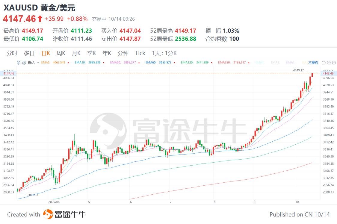 国际金价持续走强,现货黄金今日盘中升破4140美元/盎司关口,至4149美元,再创历史新高。现货黄金年内累涨超58%。