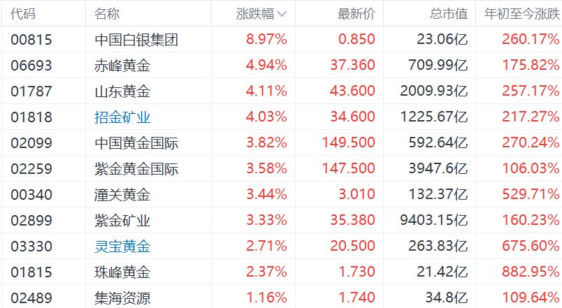 港股异动丨金价首度升破4140美元,黄金股集体高开,招金矿业涨超4%