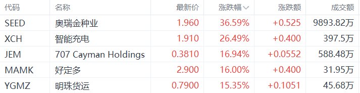 美股异动丨奥瑞金种业涨36.59%,为涨幅最大的中概股