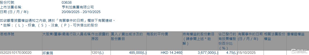 格隆汇10月20日丨根据联交所最新权益披露资料显示,2025年10月15日,亨利加集团(03638.HK)遭股东邱素娟在场内以每股均价14.246港元减持48.5万股,涉资约690.93万港元。