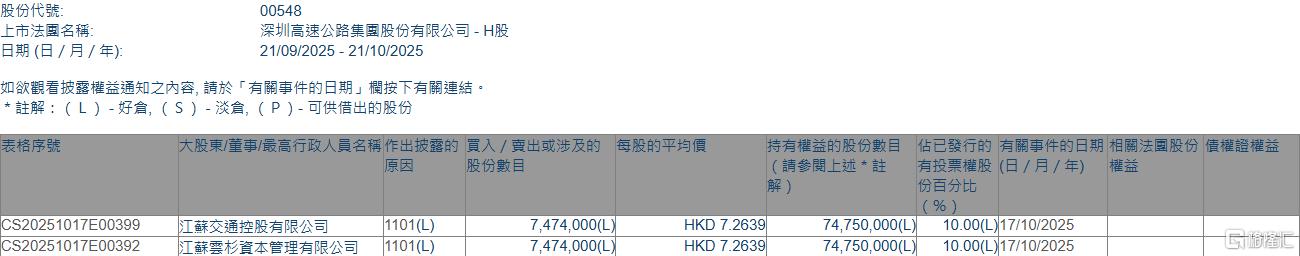格隆汇10月21日丨根据联交所最新权益披露资料显示,2025年10月17日,深圳高速公路股份(00548.HK)获江苏云杉资本管理有限公司在场内以每股均价7.2639港元增持747.4万股,涉资约5429.04万港元。