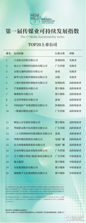 日前,由中国新闻文化促进会指导,香港中文大学商业可持续发展中心、中国传媒大学国家治理研究院、联合国教科文组织媒介素养联盟成员单位《传媒1号》联合发起的"第一届传媒业可持续发展指数"正式发布,大麦娱乐控股有限公司登顶"TOP20上市公司"总榜。