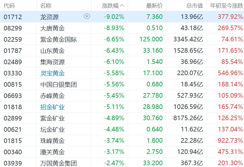 港股市场黄金及贵金属概念股全线低开,其中,龙资源跌9%,大唐黄金跌近9%,紫金黄金国际、山东黄金、集海资源跌超6%,灵宝黄金、中国白银集团、赤峰黄金、招金矿业跌超5%,紫金矿业、坛金矿业跌超4%。