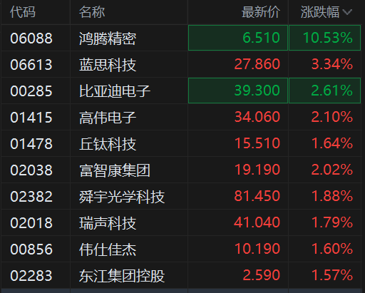 港股异动丨苹果概念股继续拉升 鸿腾精密涨超10% 瑞声科技涨约2%