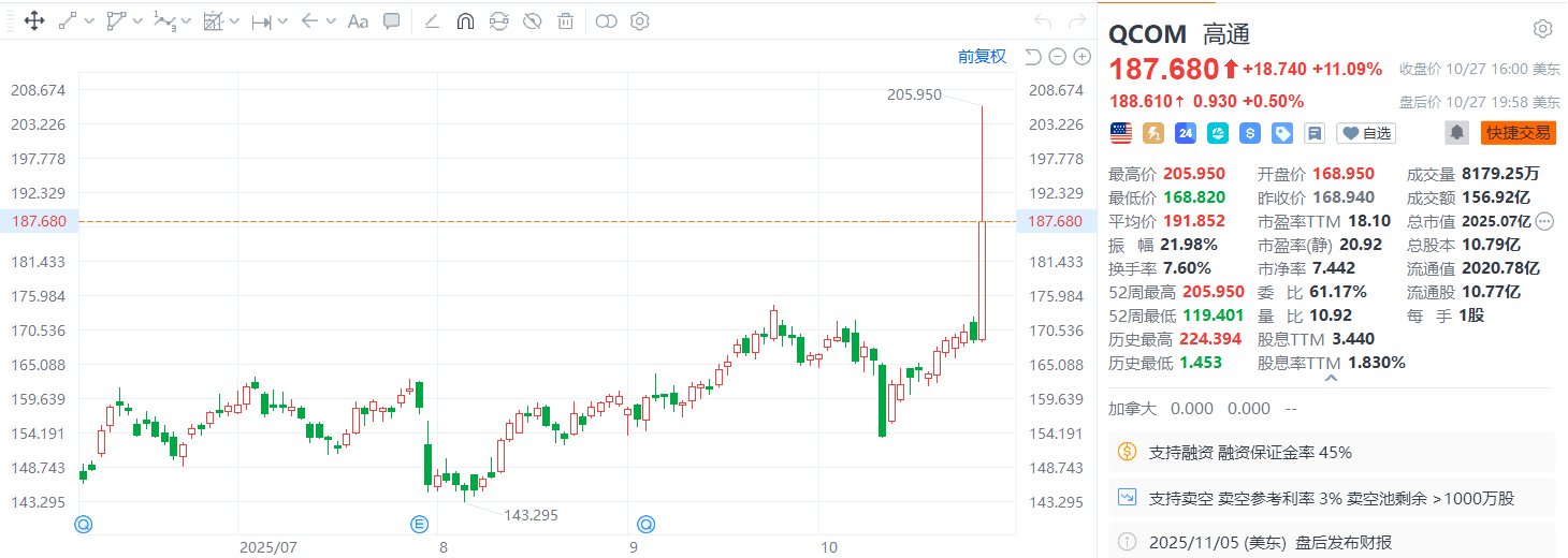 高通(QCOM.US)盘中一度飙升近21%,最终收涨11.09%报187.68美元,成交额156.93亿美元,总市值2025.07亿美元。消息上,高通宣布推出与AMD和英伟达竞争的人工智能处理器。此次推出AI芯片标志着高通的战略转型,该公司此前主要专注于无线连接和移动设备半导体领域,而非大型数据中心业务。