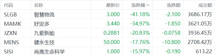 中概股收盘跌幅前五的个股为:智慧物流跌71.18%,好定多跌34.97%,九紫新能跌20.83%,健永生技跌17.76%,尚高生命科学跌15.97%。(格隆汇)