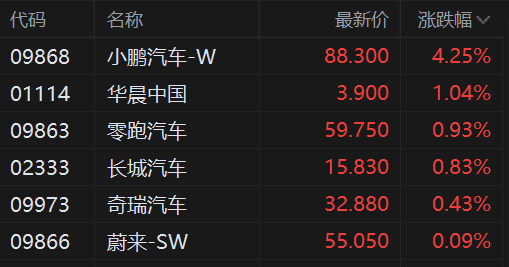 港股汽车股多数上涨,其中,前三季度海外累计交付同比大增125%,小鹏汽车盘中冲高超5%领涨,华晨中国、奇瑞汽车、零跑汽车、长城汽车、蔚来汽车均飘红。