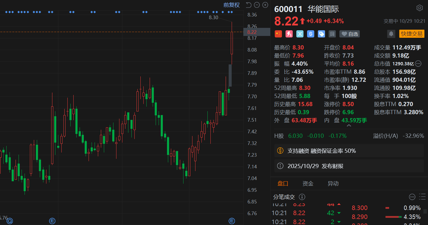 受业绩影响,华能国际(600011.SH)今日跳空高开,盘初一度涨超7%,高见8.3元创14个月新高,总市值1292亿元。消息上,华能国际第三季度营收为609.43亿元,同比下降7.09%;净利润为55.79亿元,同比增长88.54%。前三季度营收为1729.75亿元,同比下降6.19%;净利润为148.41亿元,同比增长42.52%。业绩增长主要由于境内燃料成本同比下降。此外,公司日前发行了今年第十期超短期融资券,筹集30亿元人民币用于支持营运资金和偿还债务。(格隆汇)