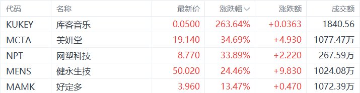中概股收盘涨幅前五的个股为:库客音乐涨263.64%,美妍堂涨34.69%,网塑科技涨33.89%,健永生技涨24.46%,好定多涨13.47%。(格隆汇)