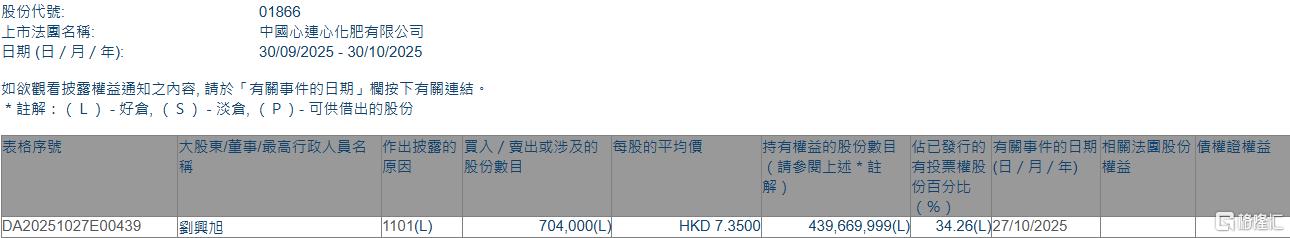 格隆汇10月30日丨根据联交所最新权益披露资料显示,2025年10月27日,中国心连心化肥(01866.HK)获执行董事兼董事会主席刘兴旭在场内以每股均价7.35港元增持70.4万股,涉资约517.44万港元。