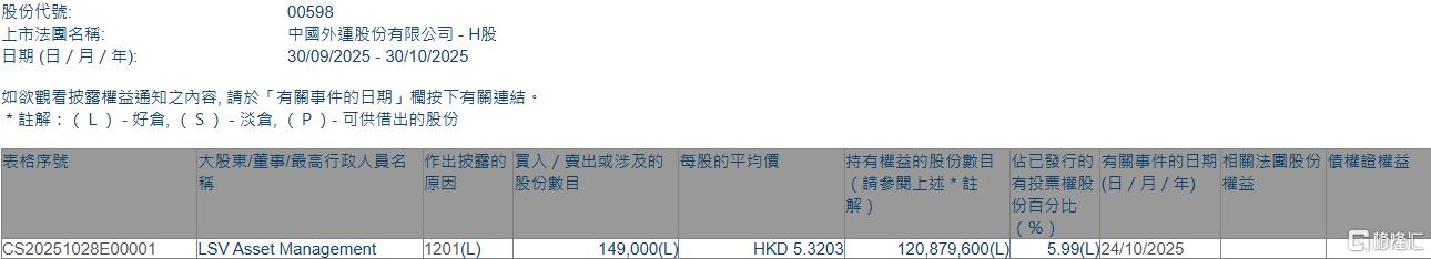 格隆汇10月30日丨根据联交所最新权益披露资料显示,2025年10月24日,中国外运(00598.HK)遭LSV Asset Management在场内以每股均价5.3203港元减持14.9万股,涉资约79.27万港元。