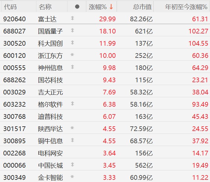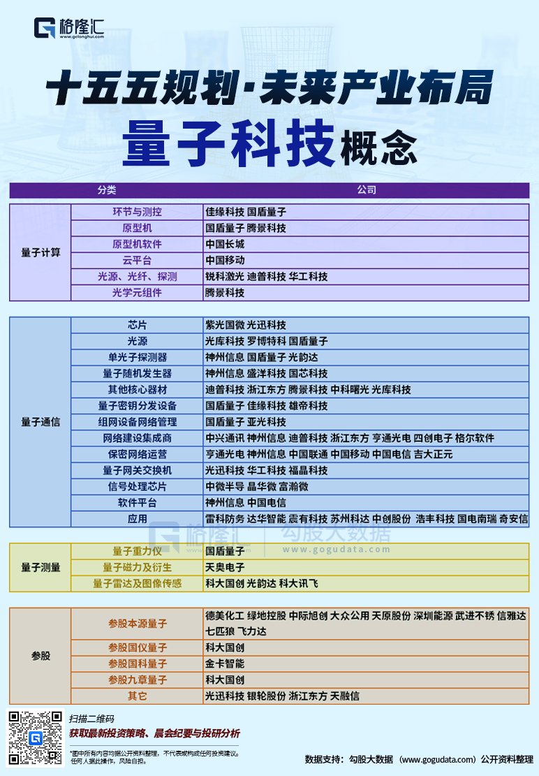 国泰海通证券研报表示,量子计算已成为最具颠覆性的前沿技术之一,根据IBM和中国信通院报告来看,量子计算目前还处于早期技术攻关阶段,预计未来5到10年有可能出现实质性进展。量子安全在应用领域还处于起步阶段,但未来的发展空间很大。中国在QKD量子安全领域处于领先地位,已经形成了以QKD技术为核心的较为完整的量子保密通信产业链。量子测量产业当前则已进入多元化发展周期。