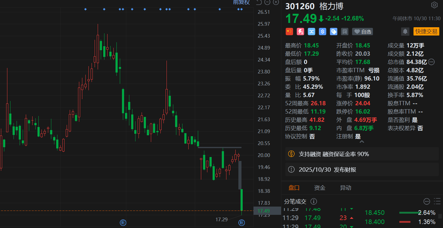 格力博(301260.SZ)午间大幅收跌12.68%,跌幅居市场首位,盘中低见17.69元刷新阶段新低,总市值84.38亿元。消息上,格力博第三季度营收为8.51亿元,下降13.85%;净利润亏损2.22亿元,下降98.08%。前三季度营收为38.28亿元,下降3.81%;净利润亏损8893.2万元,下降1056.63%。值得一提的是,公司电池已获得多家机器人公司的认可,并实现向部分客户供货。