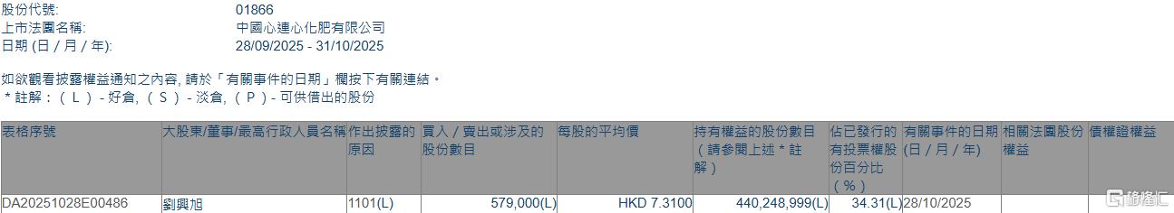 格隆汇10月31日丨根据联交所最新权益披露资料显示,2025年10月28日,中国心连心化肥(01866.HK)获执行董事兼董事会主席刘兴旭在场内以每股均价7.31港元增持57.9万股,涉资约423.25万港元。