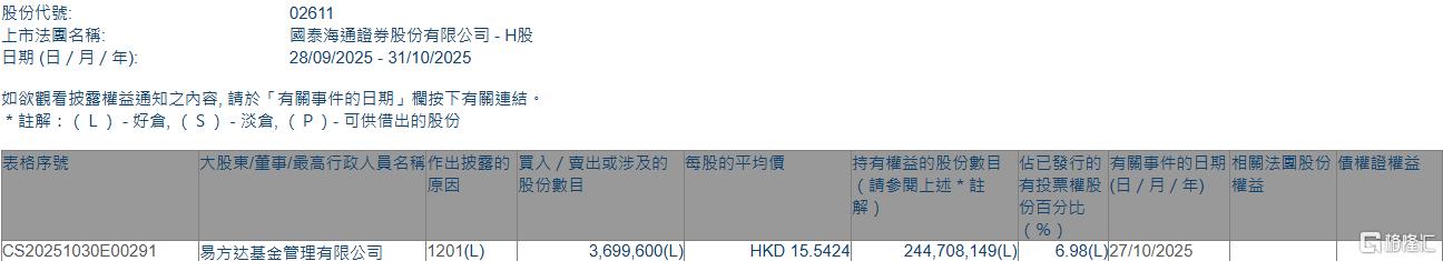 格隆汇10月31日丨根据联交所最新权益披露资料显示,2025年10月27日,国泰海通(02611.HK)遭易方达基金管理有限公司在场内以每股均价15.5424港元减持369.96万股,涉资约5750.07万港元。