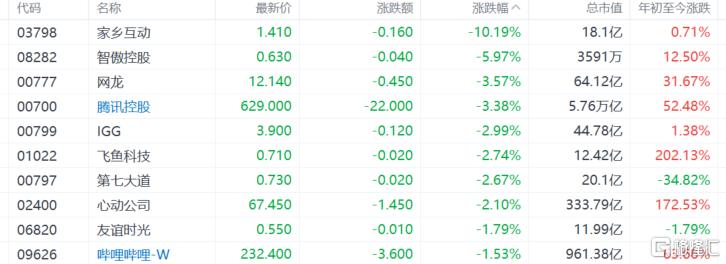 手游股大跌,家乡互动跌超10%,网龙、腾讯控股跌超3%,IGG、心动公司跌超2%。