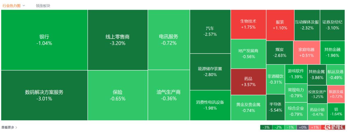 盘面上,大型科技股集体弱势拖累市场情绪,大金融股(银行、保险、券商)、中字头等权重股多数下跌,半导体芯片股全天弱势,军工股、汽车股、煤炭股、黄金股、内房股、航空股、光伏股、苹果概念股纷纷下跌。多重催化剂点燃创新药板块,教育股、家电股、濠赌股部分上涨。