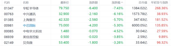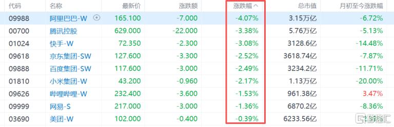 大型科技股普遍下跌,阿里巴巴跌4%,腾讯跌超3%,快手、百度、京东、小米跌幅超2%。