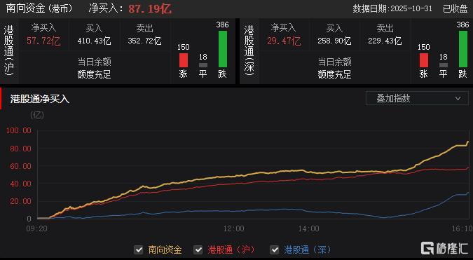 今日,南下资金净买入超87.19亿港元。其中,港股通(沪)净买入57.72亿港元,港股通(深)净买入29.47亿港元。