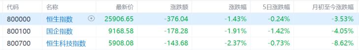 截止收盘,恒指跌1.43%再度失守26000点大关,国企指数跌1.91%,恒生科技指数跌2.37%亦失守6000点。