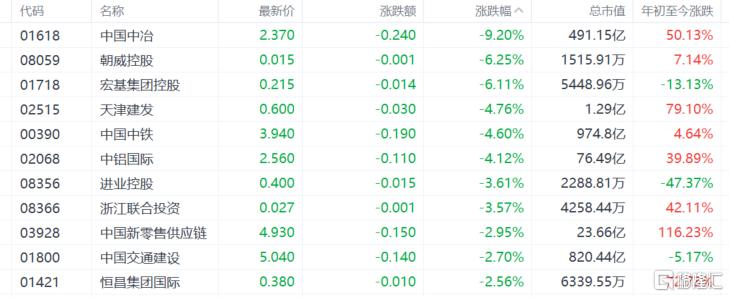 中字头股、重型基建股跌幅居前,中国中冶大跌超2%,中国中铁、中铝国际跌超4%,中国交通建设跌超2%。