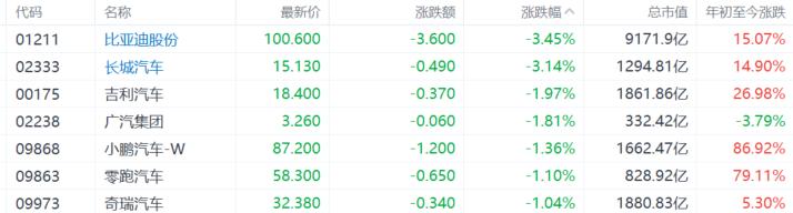 汽车股走低,比亚迪股份、长城汽车跌超3%,吉利汽车、广汽集团等跟跌。个股消息面上,比亚迪第三季度营收1950亿元,归母净利润78.2亿元。