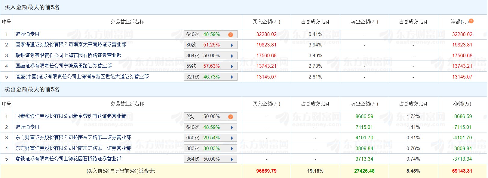 三六零(601360.SH)今日涨停,换手率6.12%,成交额50.36亿元。龙虎榜数据显示,沪股通买入3.23亿元,卖出7115万元,净买入2.52亿元;游资“作手新一”位列买二席位,买入1.98亿元;“宁波桑田路”位列买四席位,买入1.37亿元。上榜席位全天买入9.66亿元,卖出2.74亿元,合计净买入6.91亿元。(格隆汇)
