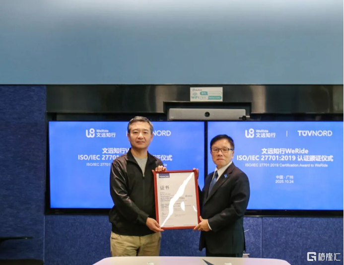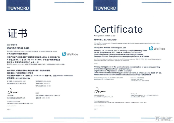 10月31日,全球领先的自动驾驶科技公司文远知行WeRide(Nasdaq: WRD)正式宣布通过国际权威机构TüV NORD北德集团的认证审核,获得ISO/IEC 27701:2019隐私信息管理体系认证,标志着文远知行在信息安全与隐私保护管理体系建设方面已符合国际领先标准,为公司进一步拓展全球业务提供了重要的合规保障。