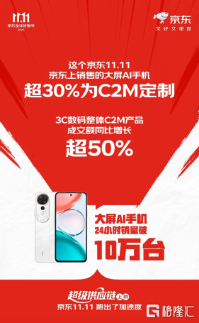 近24小时,大屏AI手机销量破10万台,搭载50系显卡的高端游戏本销量破万台,3C数码整体C2M产品成交额同比增长超50%。京东11.11期间,京东上销售的大屏AI手机超30%为C2M定制,游戏笔记本超50%为C2M定制。依托超级供应链,京东通过C2M反向定制能力构建起“需求洞察-研发生产-市场销售”的闭环链路,携手品牌共建新品,让其成为品类创新与销量增长的核心驱动力。