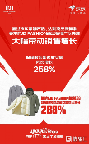 冬季保暖品质先行,京东JD FASHION带动服饰品类大幅增长,其中保暖服饰整体成交额同比增长258%,羽绒服增长6倍、羊绒衫增长8倍、毛呢大衣增长5倍,儿童毛衣、儿童棉鞋增长6倍,德训鞋、毛毛拖增长翻倍,保暖内衣、冬季睡衣家居服增长2倍;滑雪装备增长10倍,运动羽绒服、户外羽绒服增长8倍,冲锋衣裤、运动夹克风衣增长4倍,抓绒衣裤增长3倍,运动棉服增长2倍;依托于镜片集采、仓内直接配镜、一站式加工发货等供应链优势,可提供一站式配镜、发货服务的京东眼镜生态仓成交额同比增长翻倍。