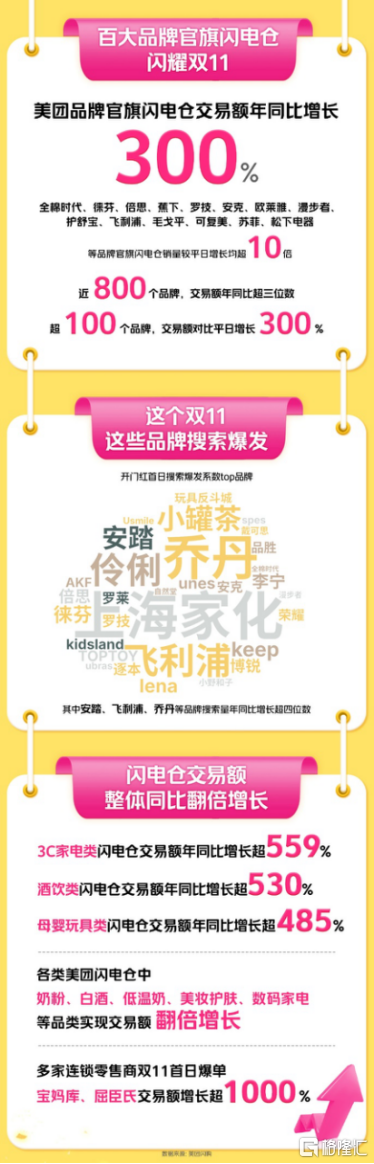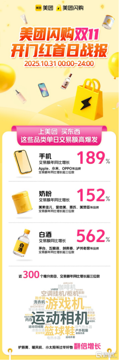 11月1日,美团闪购发布双11首日战报:自10月31日大促启动以来的24小时内,Apple、茅台、美素佳儿等近800个品牌销量同比增长超100%。全棉时代、徕芬、蕉下、罗技、毛戈平等品牌官方旗舰店销量较平日增长超10倍,上百个品牌官方旗舰店整体销量增长300%。手机、白酒、奶粉等近300类商品销量同比增长超100%:手机销量增长2倍;白酒销量增长超5倍。大量传统电商品类和新品类商品在美团闪购双11卖爆:运动相机、黄金、运动鞋服、游戏机、笔记本电脑等销量同比增长均超10倍。