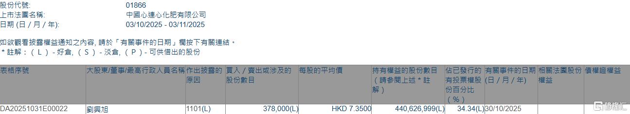 格隆汇11月3日丨根据联交所最新权益披露资料显示,2025年10月30日,中国心连心化肥(01866.HK)获执行董事兼董事会主席刘兴旭在场内以每股均价7.35港元增持37.8万股,涉资约277.83万港元。