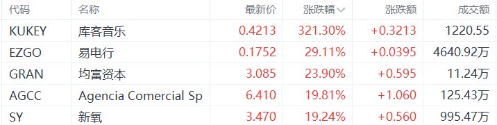 中概股收盘涨幅前五的个股为:库客音乐涨321.3%,易电行涨29.11%,均富资本涨23.9%,Agencia Comercial Sp涨19.81%,新氧涨19.23%。(格隆汇)