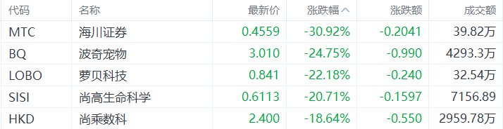 美股异动丨海川证券跌30.92%,为跌幅最大的中概股