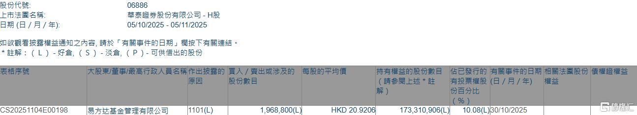 格隆汇11月5日丨根据联交所最新权益披露资料显示,2025年10月30日,华泰证券(06886.HK)获易方达基金管理有限公司在场内以每股均价20.9206港元增持196.88万股,涉资约4118.85万港元。