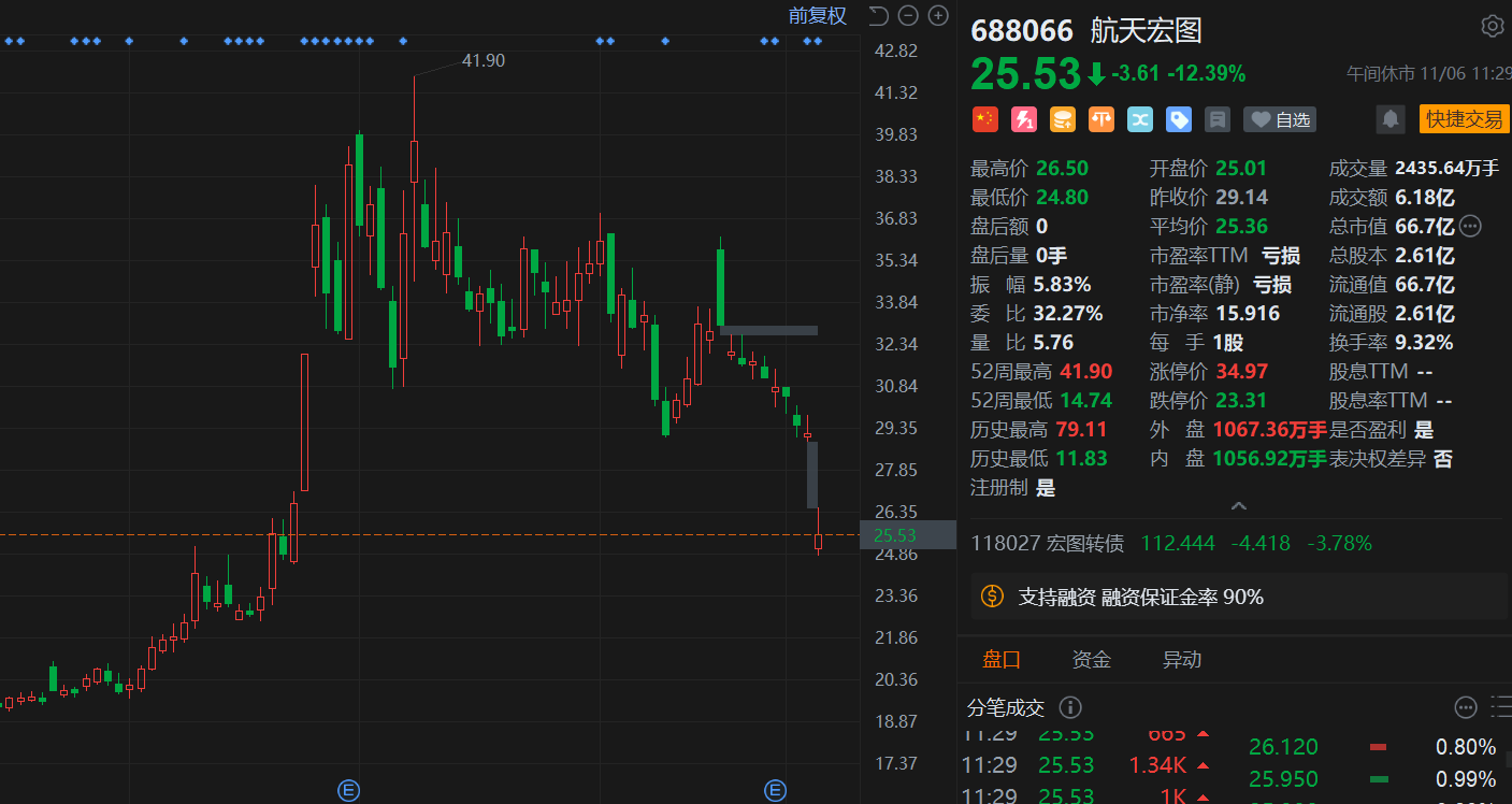 航天宏图(688066.SH)午间大幅收跌超12%,报25.53元创今年8月底以来新低,总市值66.7亿元。消息上,航天宏图公告,军队采购网于2025年11月5日发布公告,陆军后勤部采购和资产管理局根据军队供应商管理相关规定,决定自2024年7月6日至2027年7月6日暂停航天宏图信息技术股份有限公司参加全军物资工程服务采购活动资格。此举,影响了公司在特种领域储备项目的获取,期间无法参与投标,预计该事项将对公司的生产经营及经营业绩造成负面影响。