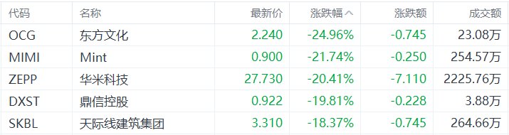 美股异动丨东方文化跌24.96%,为跌幅最大的中概股
