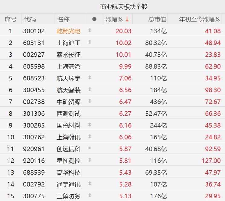 A股市场航天商业股走强,截至收盘,乾照光电20CM涨停,上海沪工、泰永长征、上海港湾10CM涨停,航天环宇涨7%,航天智装、中矿资源、西测测试、国瓷材料、上海瀚讯涨超6%,创远信科、星图测控、高华科技、通宇通讯、三角防务涨超5%。