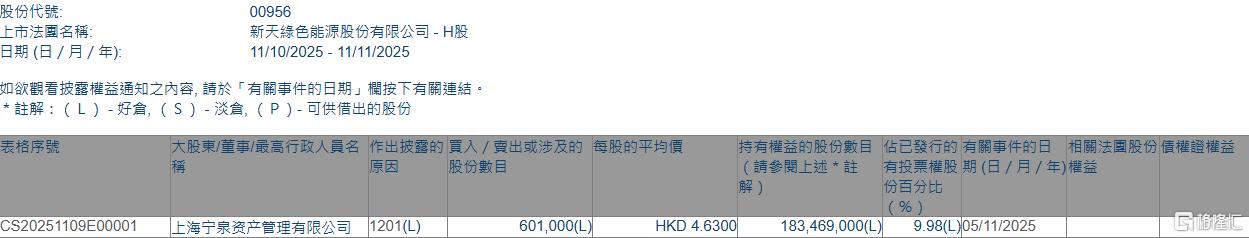 格隆汇11月11日丨根据联交所最新权益披露资料显示,2025年11月5日,新天绿色能源(00956.HK)遭上海宁泉资产管理有限公司在场内以每股均价4.63港元减持60.1万股,涉资约278.26万港元。