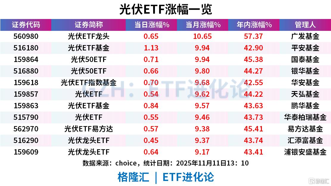 11月以来,新能源赛道领涨,光伏ETF龙头涨超10%;光伏ETF基金、光伏50ETF、光伏ETF指数基金、光伏ETF、光伏ETF易方达、光伏龙头ETF涨超9%,成为11月以来表现最好的ETF。
