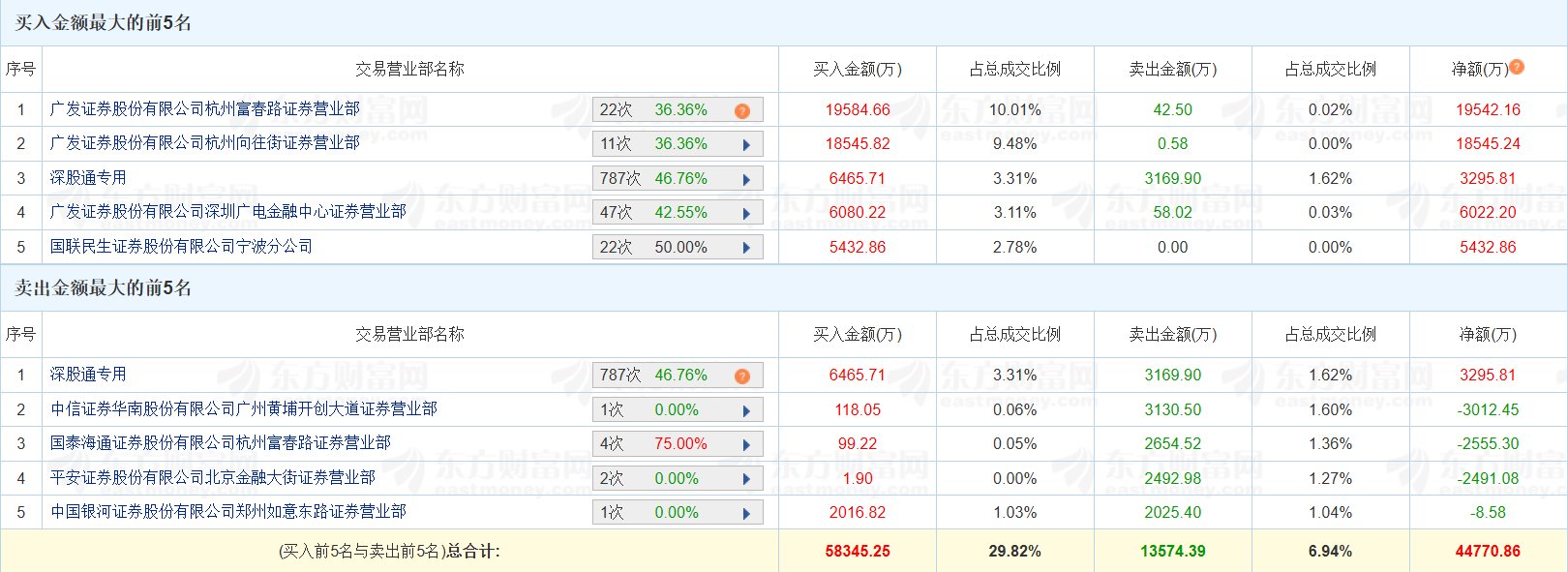 炬华科技(300360.SZ)今日20CM涨停,换手率20.19%,成交额19.56亿元。龙虎榜数据显示,深股通净买入3296万元;广发证券杭州富春路证券营业部位列买一席位,净买入1.95亿元;广发证券杭州向往街证券营业部位列买二席位,净买入1.85亿元。上榜席位全天买入5.83亿元,卖出1.36亿元,合计净买入4.48亿元。(格隆汇)