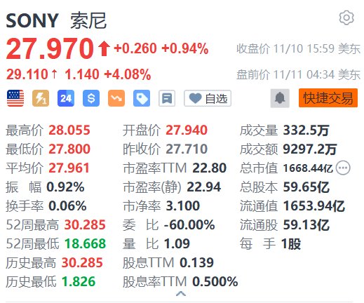 索尼(SONY.US)盘前涨4.08%,报29.11美元。消息面上,索尼集团第二季度经营利润4,289.7亿日元,预估3,921.6亿日元;销售净额3.11万亿日元,预估3.01万亿日元。索尼目前预计2025财年经营利润为1.43万亿日元,此前预期为1.33万亿日元。索尼认为,美国关税影响比之前预期的小,目前预计为500亿日元。此外,根据东京证券交易所周二的一份文件,索尼集团董事会批准了一项1000亿日元的股票回购计划,允许该公司回购至多3500万股,占其已发行股票的0.6%。