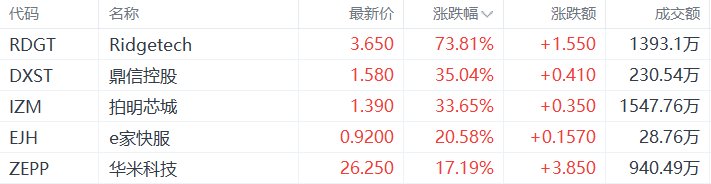 美股异动丨Ridgetech涨73.81%,为涨幅最大的中概股