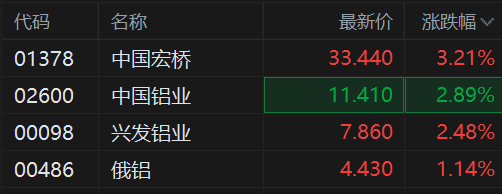 港股铝业股持续上涨行情,其中,中国宏桥盘中涨超5%创历史新高,中国铝业涨超3%同样刷新阶段新高价,兴发铝业涨2.5%,俄铝涨超1%。