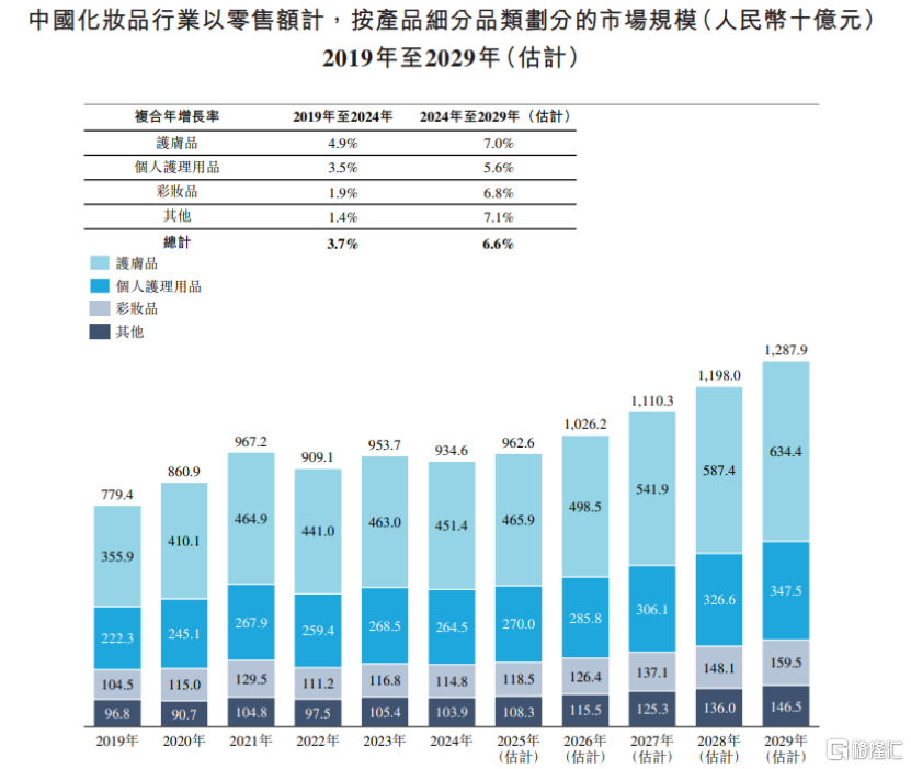 据弗若斯特沙利文的资料,中国化妆品行业较为分散,2024年前五大品牌的市场份额仅8.9%;以2024年零售额计算,珀莱雅以1.3%的市场份额成为中国第四大化妆品品牌,也是前五大化妆品品牌中唯一的本土品牌。