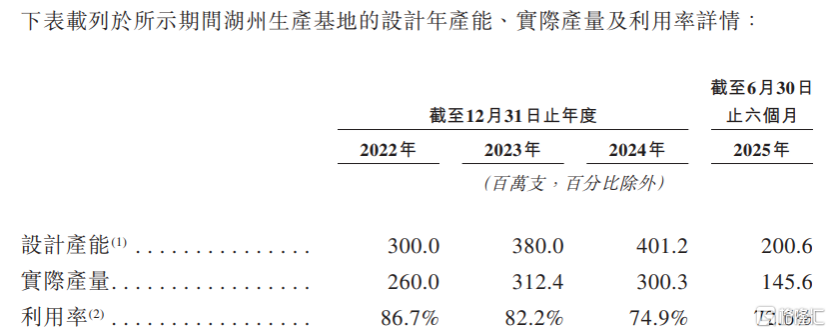 公司在浙江省湖州的生产基地设有66条生产线,主要生产护肤品。但湖州生产基地的产能利用率却呈逐年下滑趋势,从2022年的86.7%降至2025年上半年的72.6%。